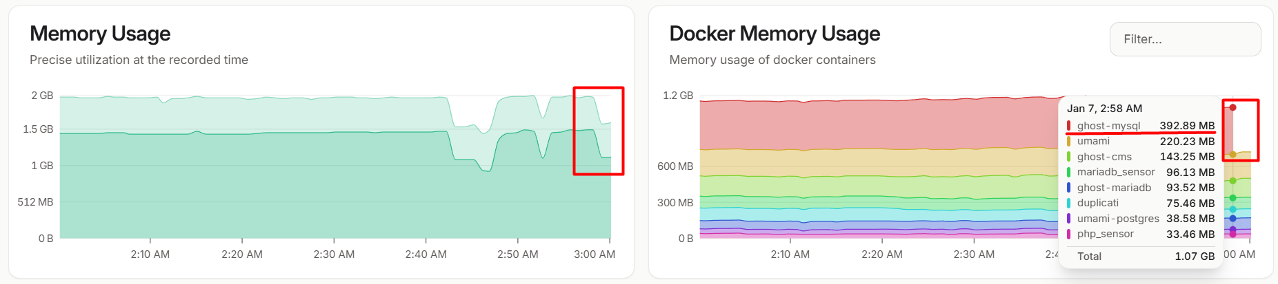 Docker confirmed it. The Ghost MySQL container alone was consuming more than 400 MB of memory, roughly 20% of my total RAM.